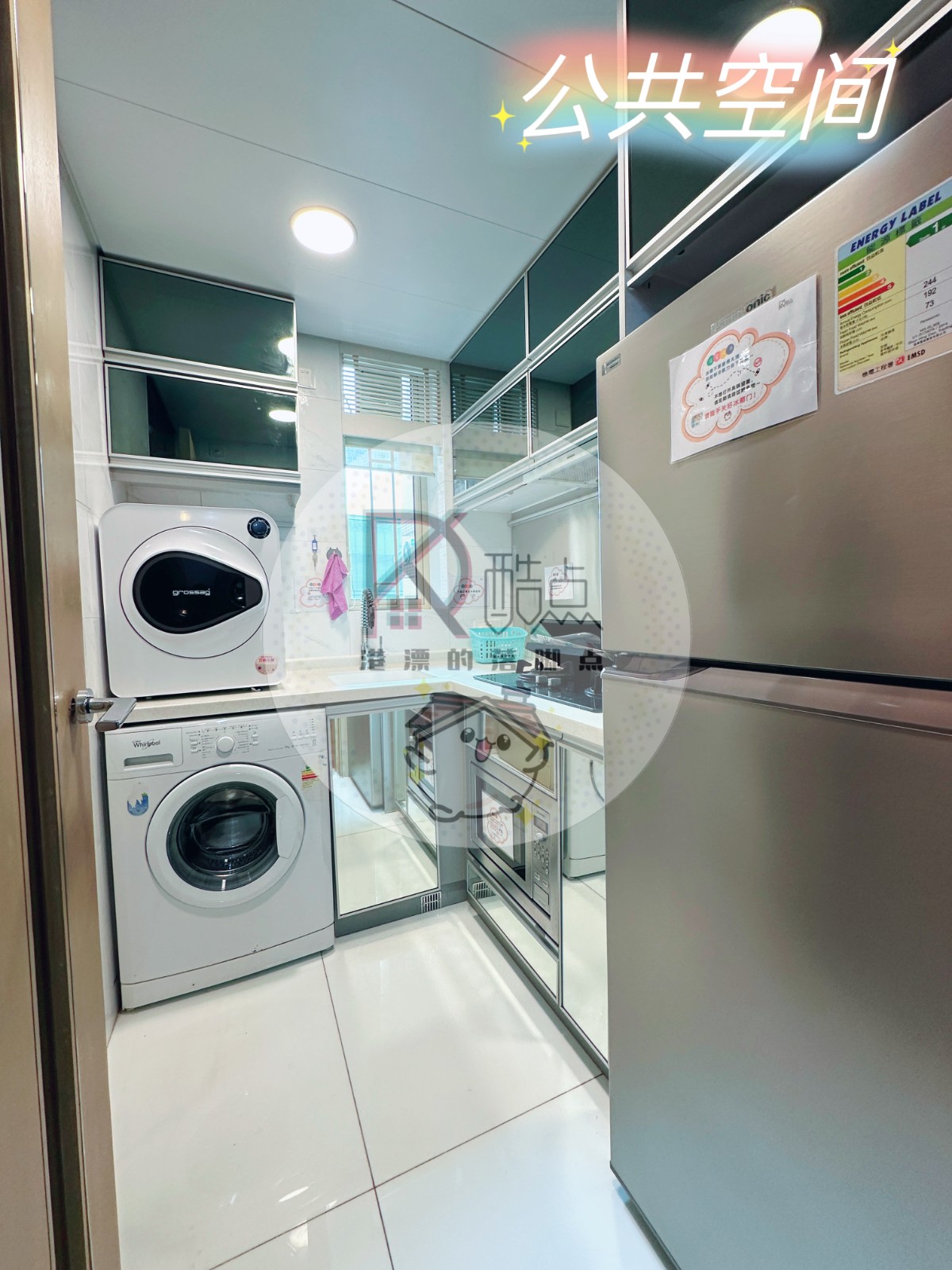 电器:洗烘一体洗衣机、房门独立电子密码门锁、冰箱、微波炉、煮食炉、抽油烟机、热水器、热水煲、大门独立电子密码门锁