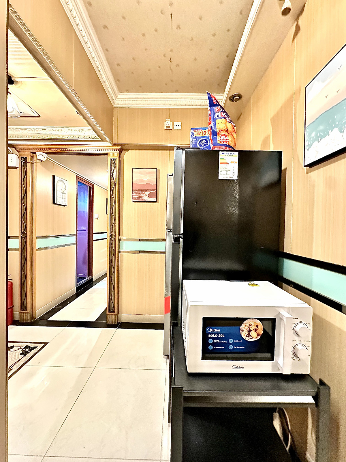 电器:洗烘一体洗衣机、房门独立电子密码门锁、冰箱、微波炉、煮食炉、抽油烟机、热水器、热水煲、大门独立电子密码门锁