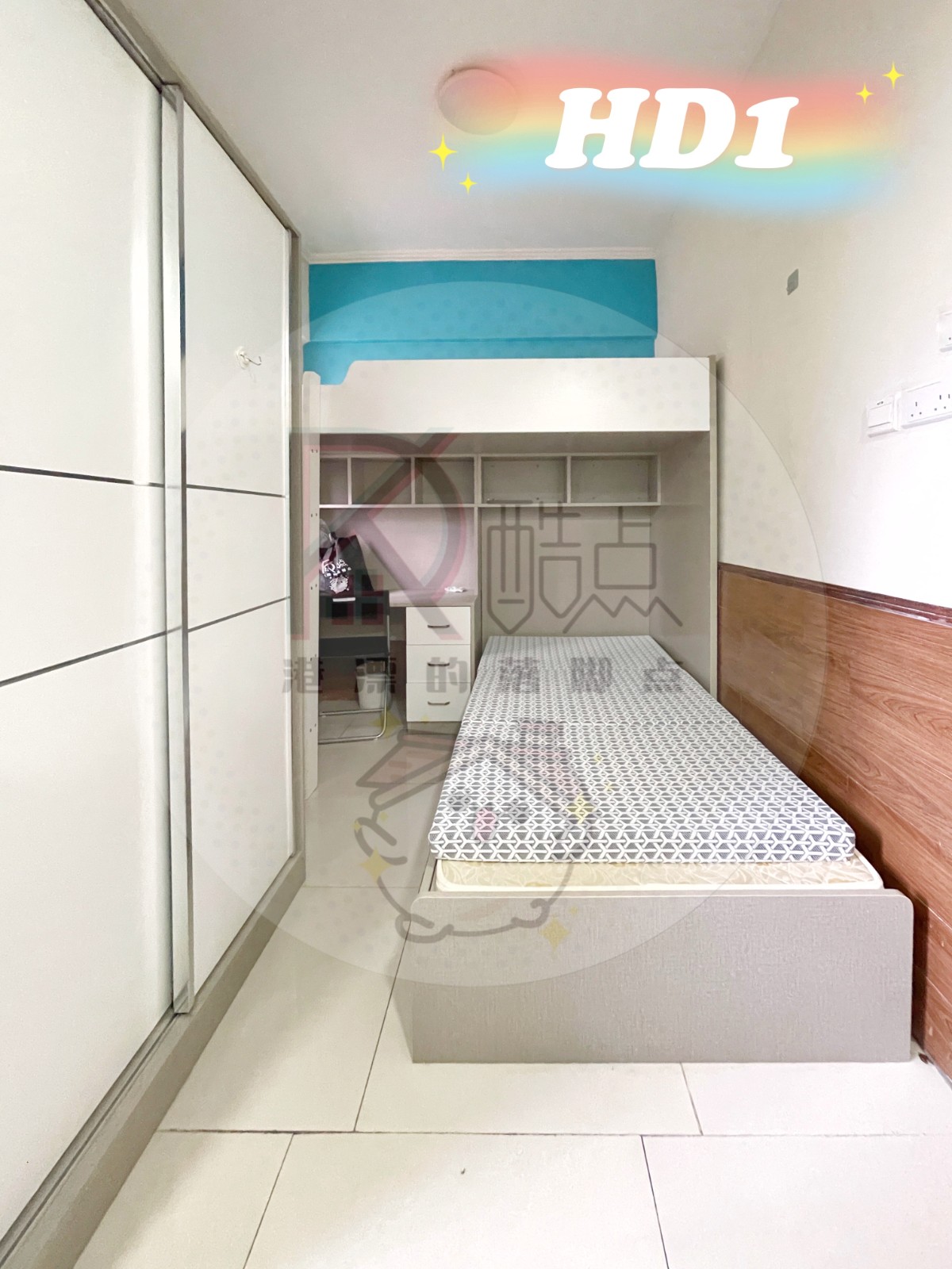 电器:洗烘一体洗衣机、房门独立电子密码门锁、冰箱、微波炉、煮食炉、抽油烟机、热水器、热水煲、大门独立电子密码门锁