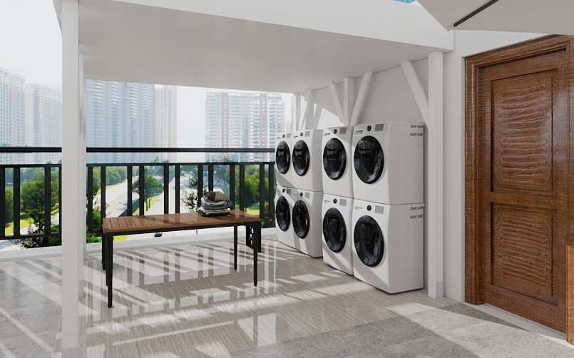 电器:洗烘一体洗衣机、房门独立电子密码门锁、冰箱、微波炉、煮食炉、抽油烟机、热水器、热水煲、大门独立电子密码门锁