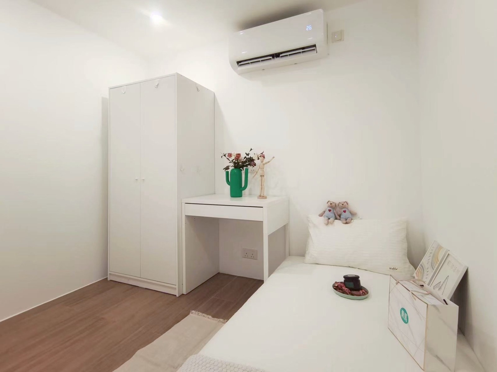 配置全套家具,拎包入住。包括衣柜、床架、床垫、窗帘、书桌、椅子、空调等(PS:少数公寓有沙发、茶几等额外情况,看公寓图片来)