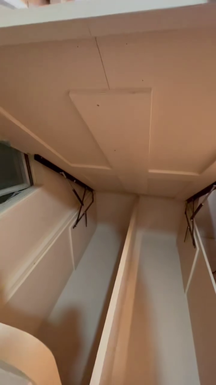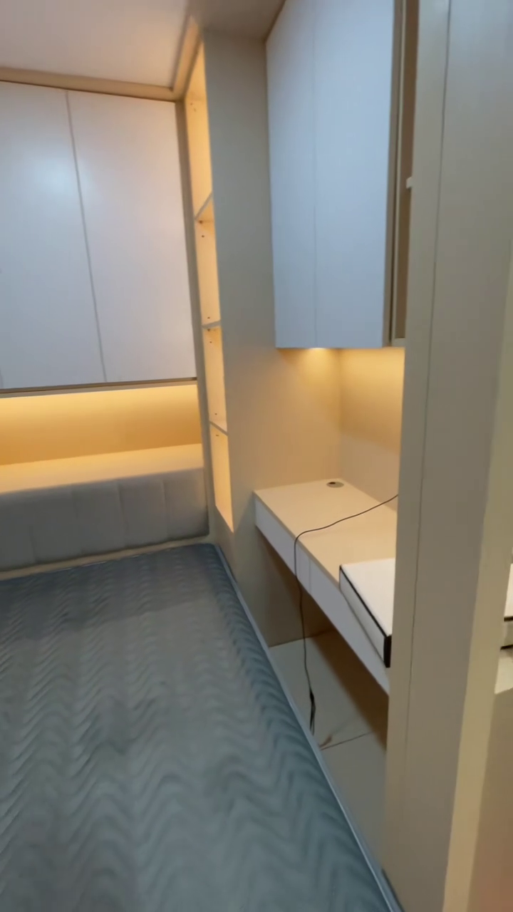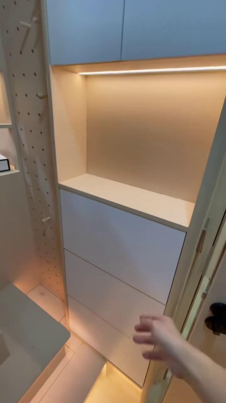 床铺下方设计储物空间,墙上有洞洞板方便收纳。