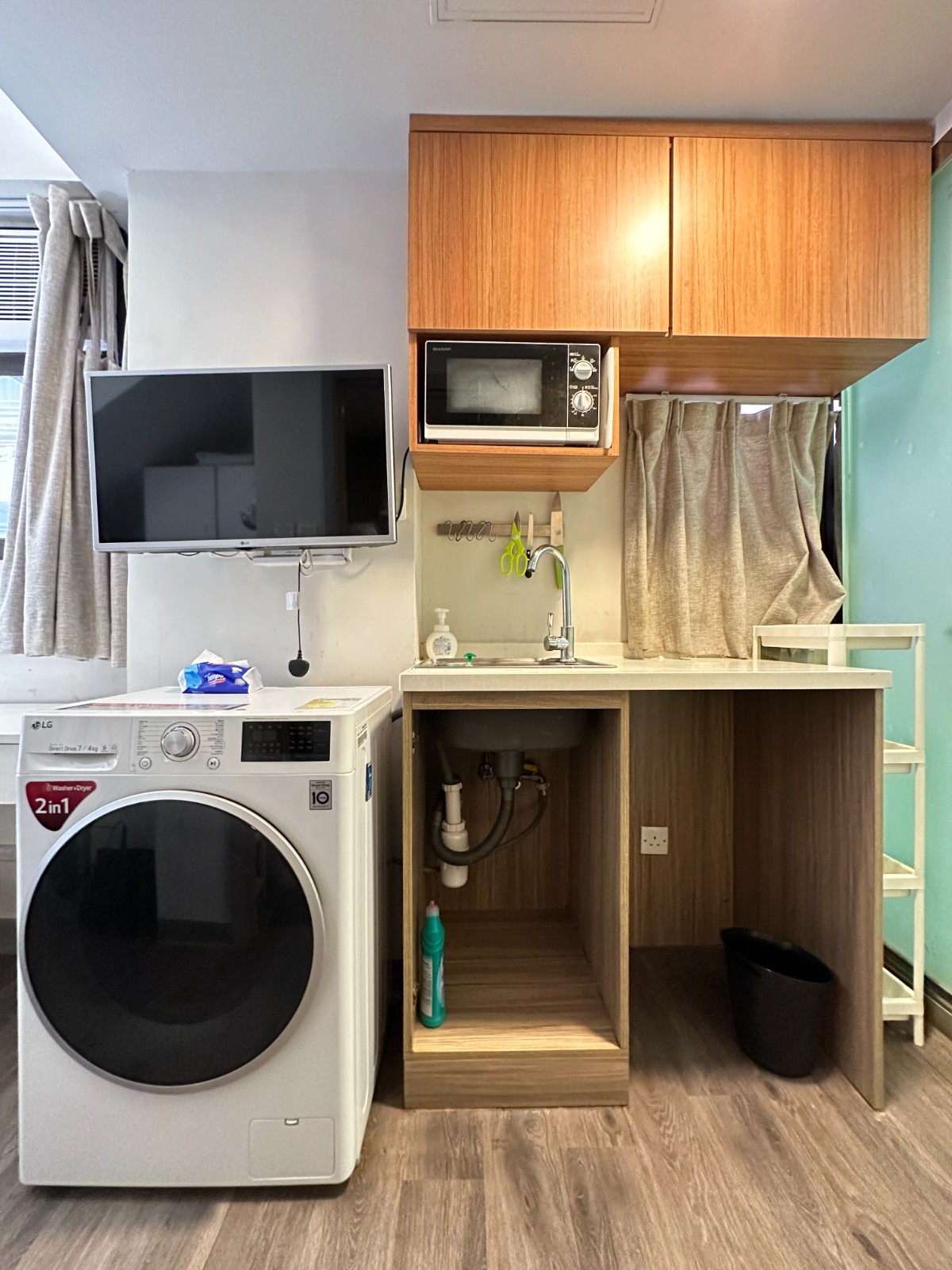 电器:洗烘一体洗衣机、房门独立电子密码门锁、冰箱、微波炉、煮食炉、抽油烟机、热水器、热水煲、大门独立电子密码门锁